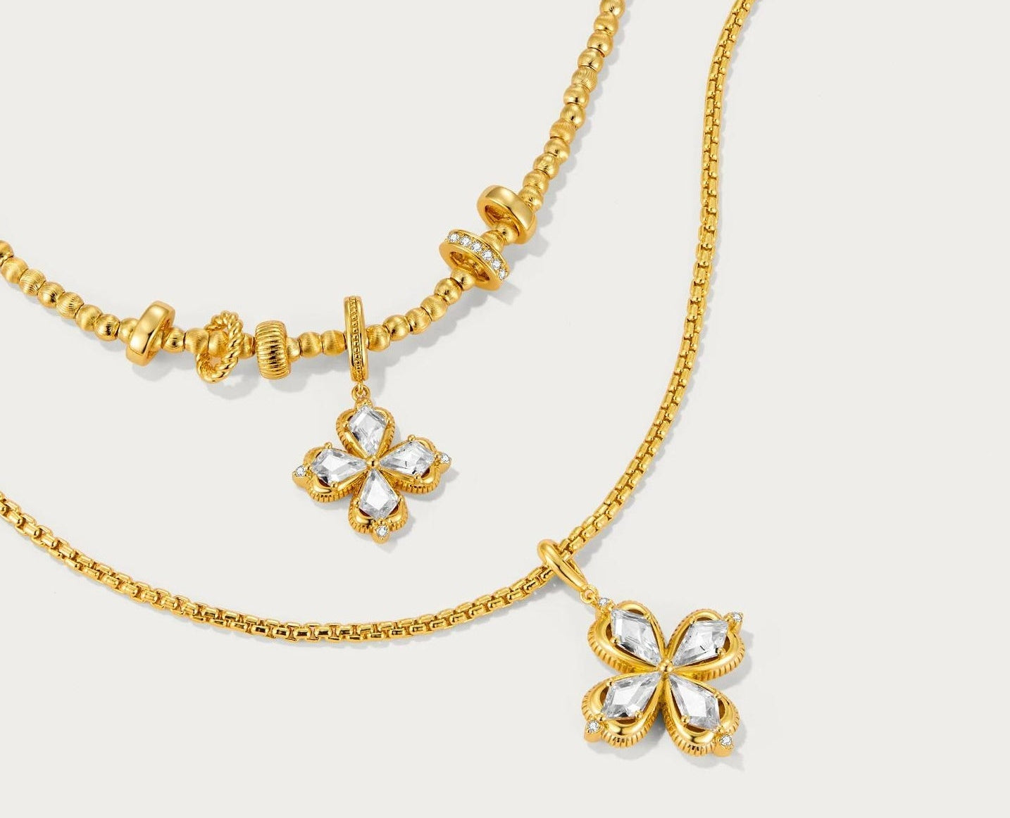 上質感あふれるゴールドカラーのネックレス。四葉のクローバーモチーフとキラキラと輝くストーンが、洗練された印象を与えます。