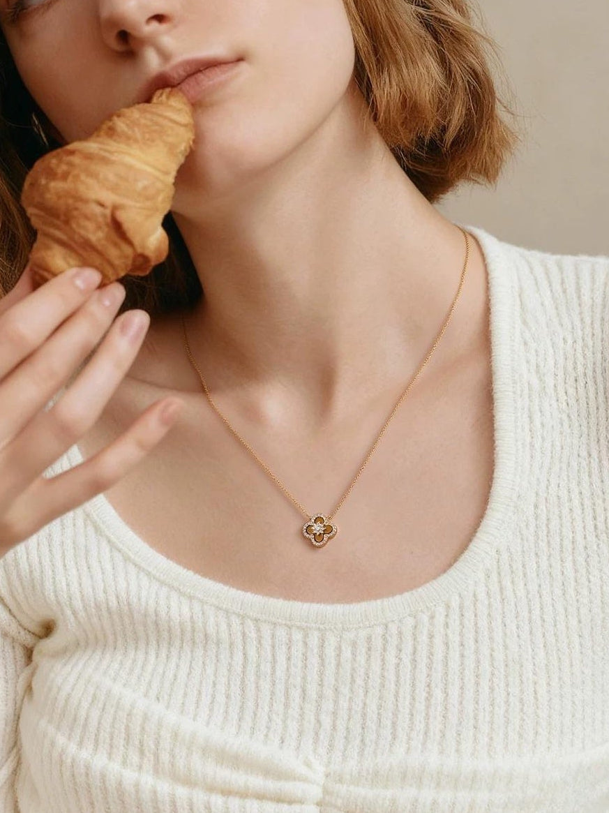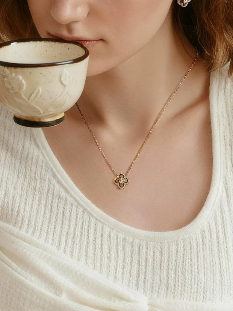 上品なデザインで、ゴールドのチェーンに花の形をしたペンダントがついています。