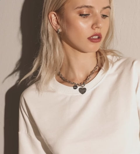 シルバーハートの文字が、とても可愛らしく、シンプルなTシャツと相性抜群◎