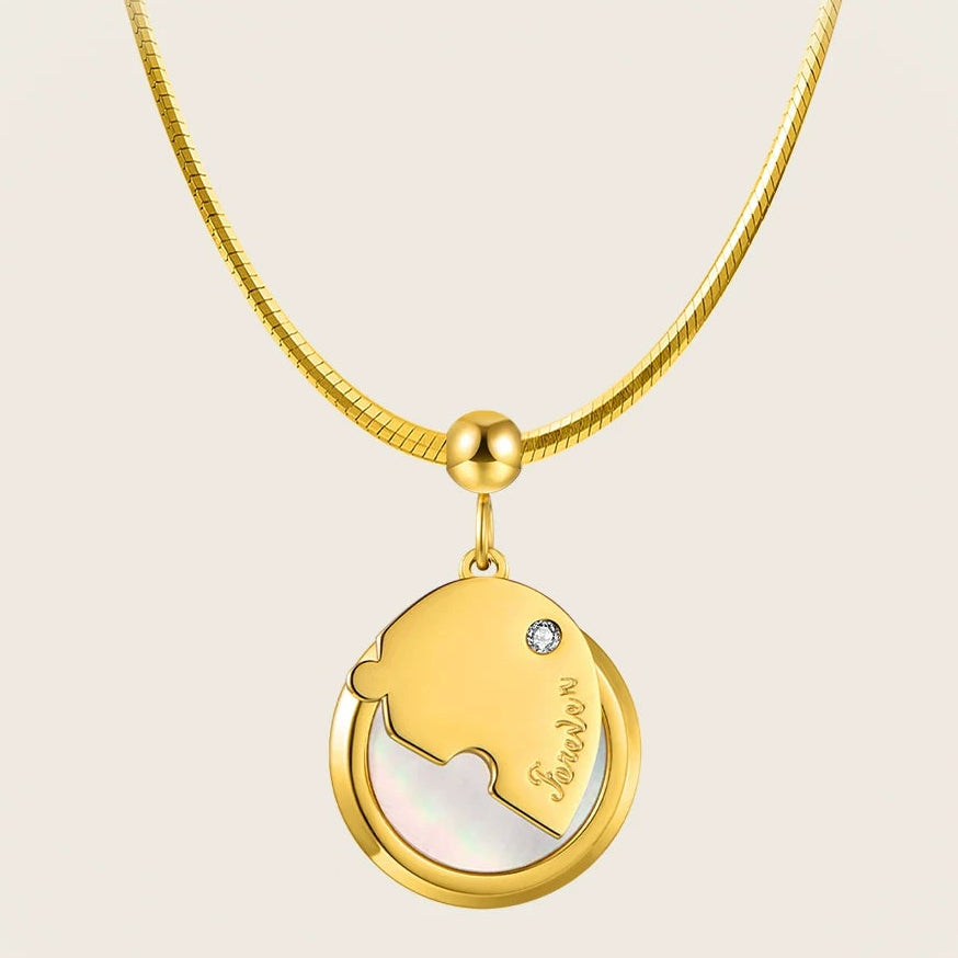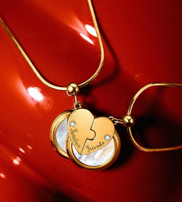 金色のハート型デザインが特徴のネックレスは、優美なパール調のディテールが輝きます。