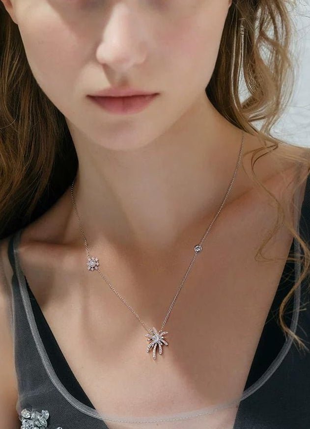 華やかなデザインが際立つロマンティックなファイヤー ワーク ペンダント ネックレス。繊細なチェーンに輝く星型のモチーフが特徴で、上質な輝きを放ちます。