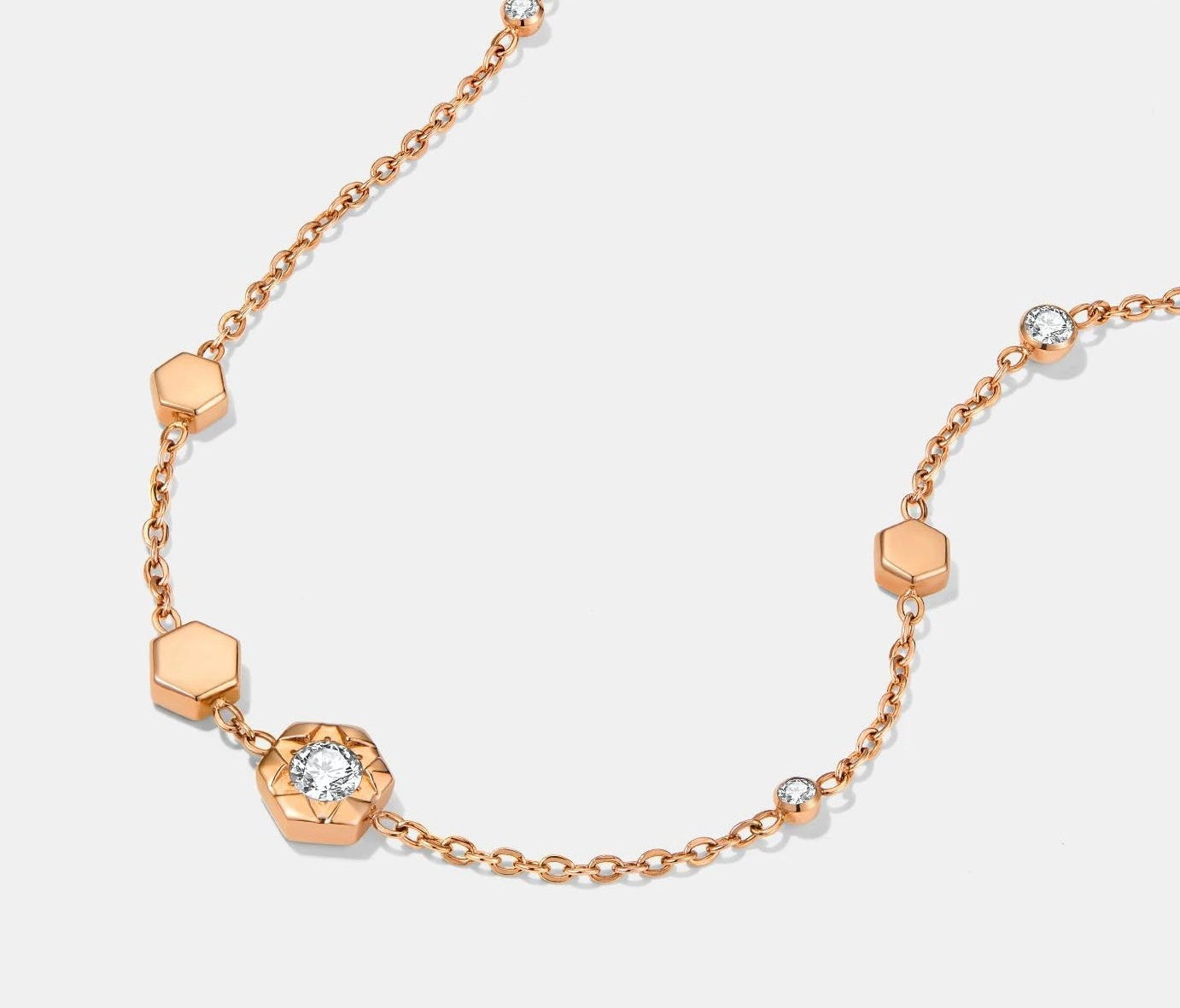 六角形のチャームと大きなジルコンがアクセントとなり、上品さを演出。