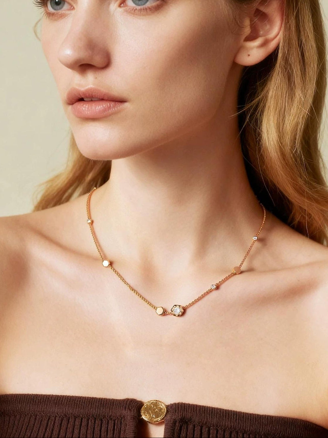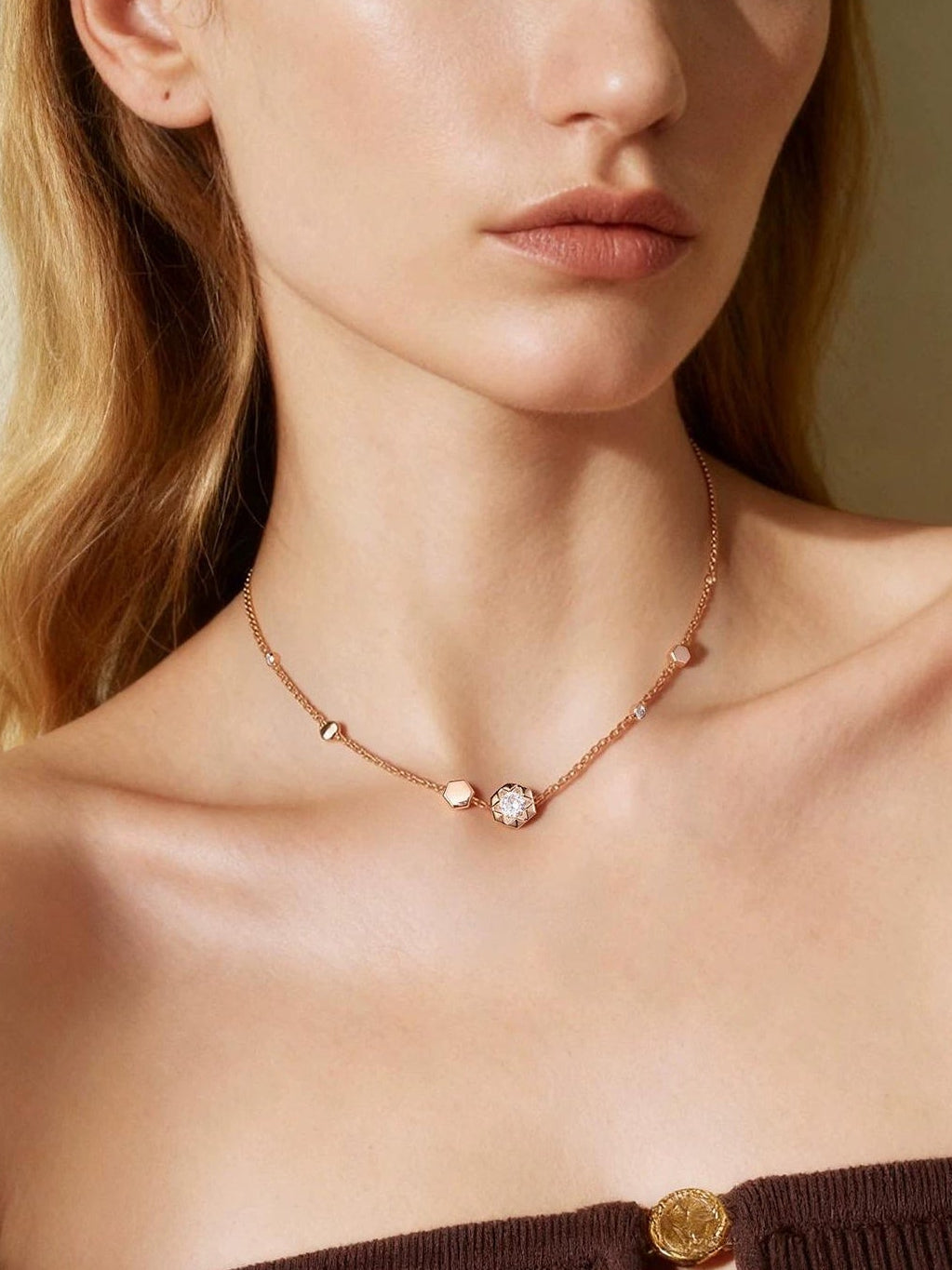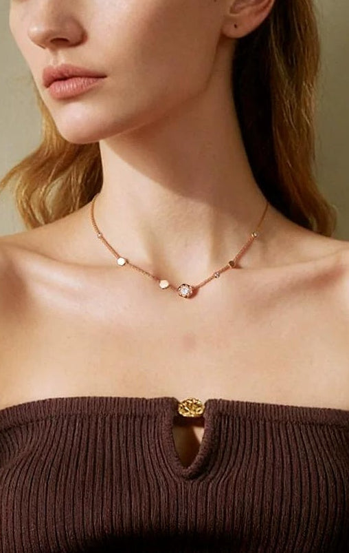美しいバラゴールドの素材で仕立てられたコラボネックレスは、シンプルながらも華やかなデザイン。
